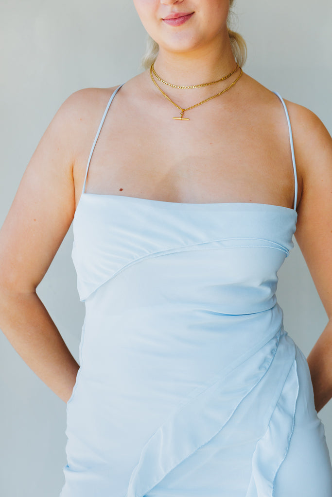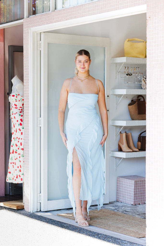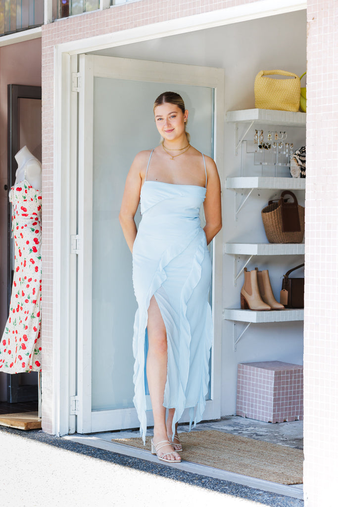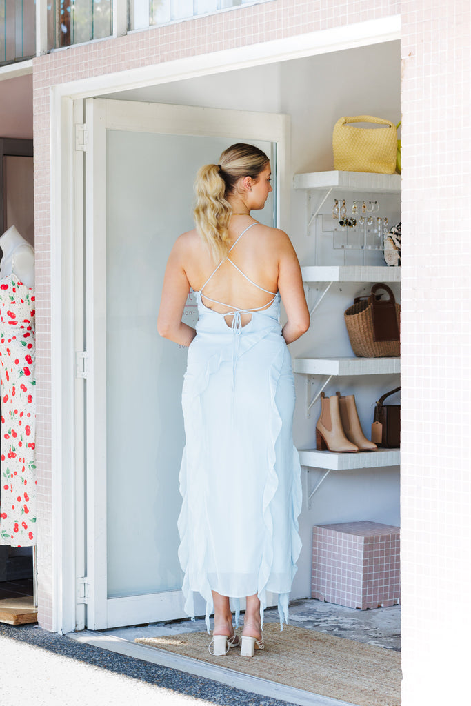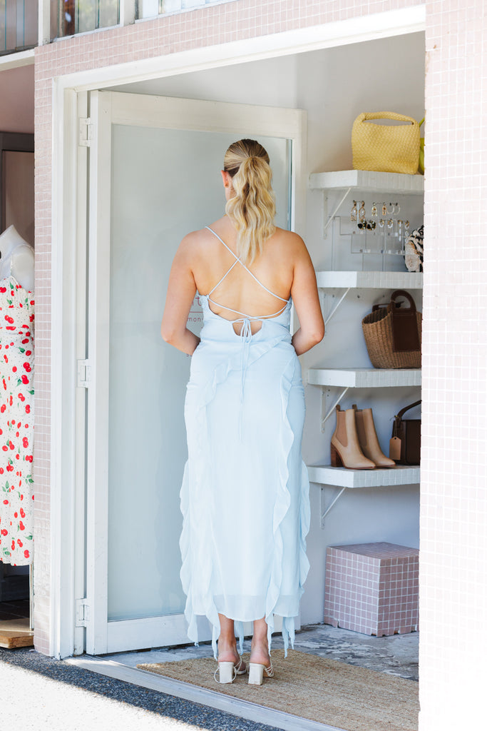 - Stunning floaty sky blue asymmetrical frilled maxi dress