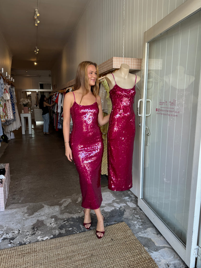- Rich berry toned sequins in a flattering cut