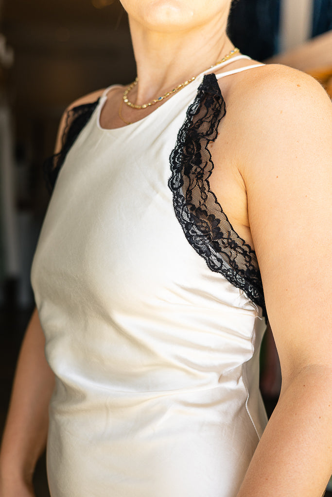 - Glam satin and lace tie back slip dress
