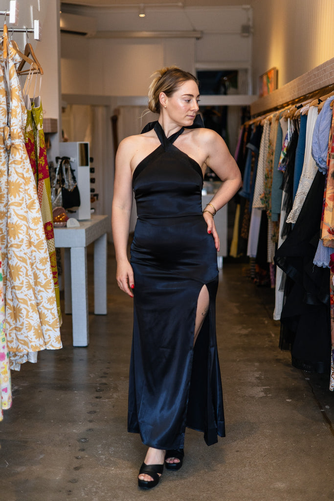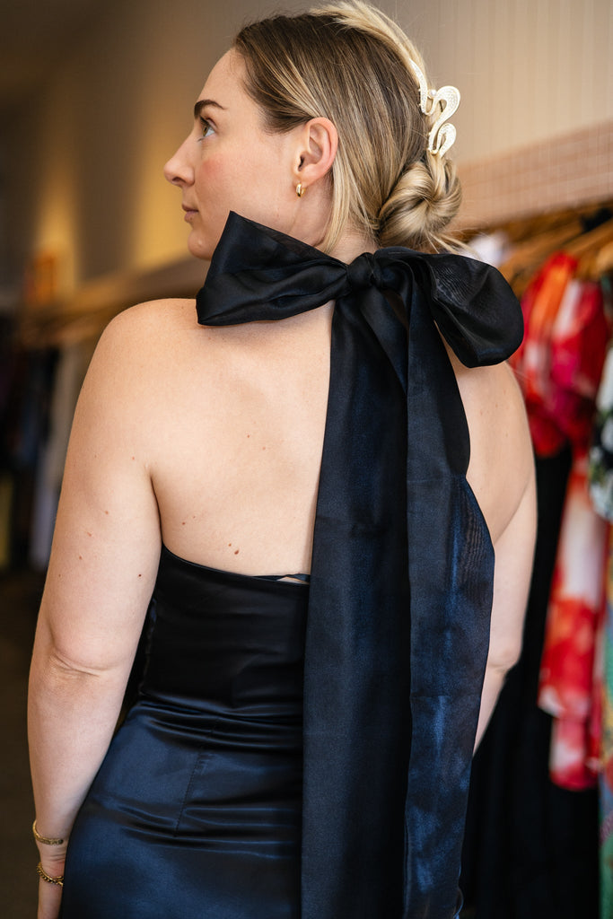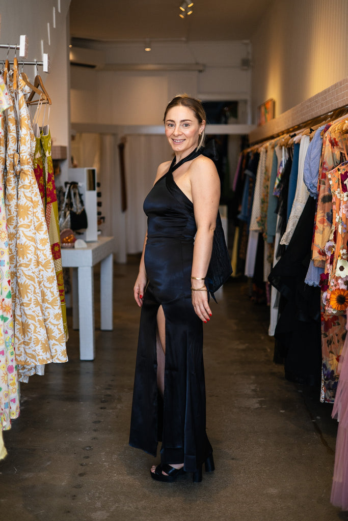 Black elegant maxi dress with halter neck. Low back and bow tie up neck. Satin fabric, 90% polyester 10% spandex. Maudie wears size 10